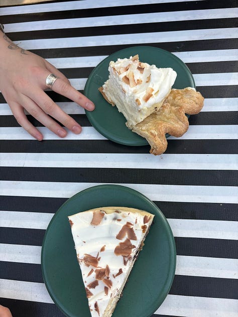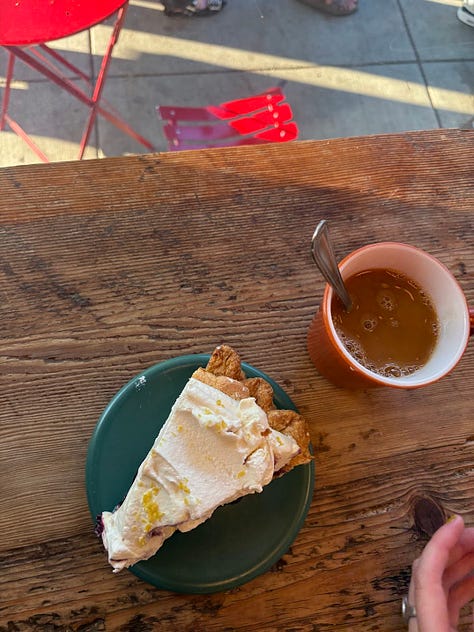 Pie/cake/other baked goods at Lauretta Jean’s (and occasionally other places but I am loyal to Laurettas). I am not at all a pie person but I am being converted slowly, except I still don’t like fruit pies much. Yesterday, I shared one of the best cakes of my life there with a friend– it was maple pumpkin and it was perfect. I want to get married in the fall so I can have this cake at my wedding. I didn’t capture this one but just trust it was a beautiful treat for a Tuesday.